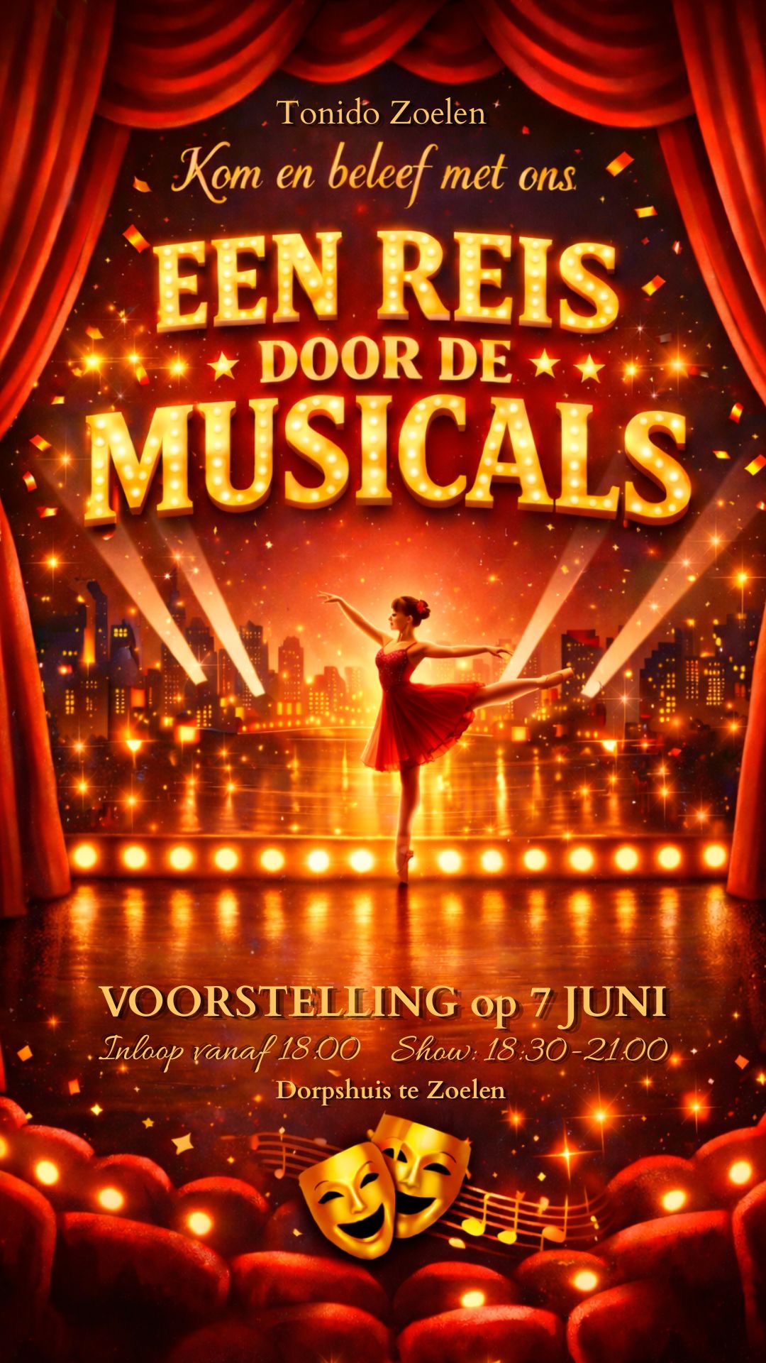 Tonido Zoelen geeft op zondag 7 juni een dansvoorstelling met de titel “Een Reis door de Musicals”. Meerdere dansgroepen brengen verhalen tot leven door beweging, emotie en energie. Samen vormen ze een hechte groep, waarin passie voor dans en theater centraal staat, en waarin ieder optreden het publiek meeneemt in de magie van musicals.